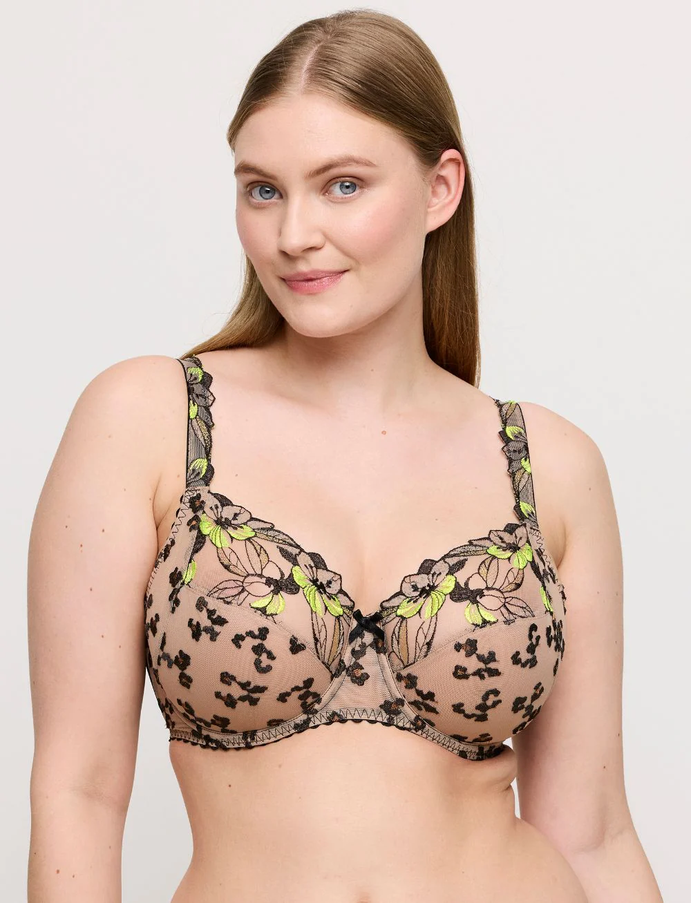 The Primadonna Manali Full Cup Bra Wild Bloom combines vibrant neon floral embroidery with eye-catching leopard print for a lively and playful touch. Its full cup design offers excellent support while adding a pop of high-fashion flair to your everyday lingerie!